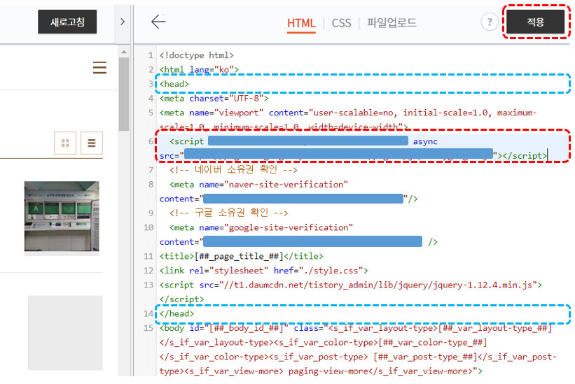 오른쪽에 열리는 html 편집창에서 <head>와 </head> 사이에 스크립트를 넣어 줍니다. html을 잘 모르시는 분은 타 코드에 영향을 주지 않도록 주의하시구요, 보이시는 것처럼 <meta> 아래에 바로 넣어 주시면 됩니다 그리고는 적용을 눌러 주세요