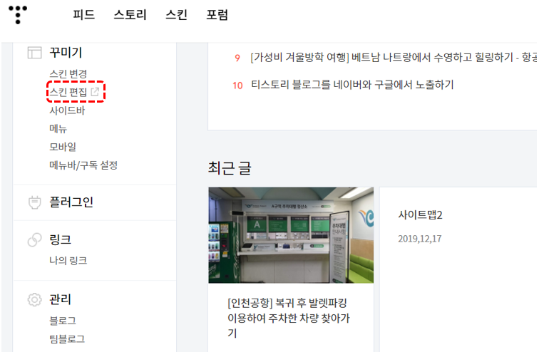복사하기를 눌러서 코드를 복사한 후에 자신의 티스토리 불로그로 접속 합니다. 왼쪽 사이드바 메뉴중 꾸미기 - 스킨편집을 선택해 주세요