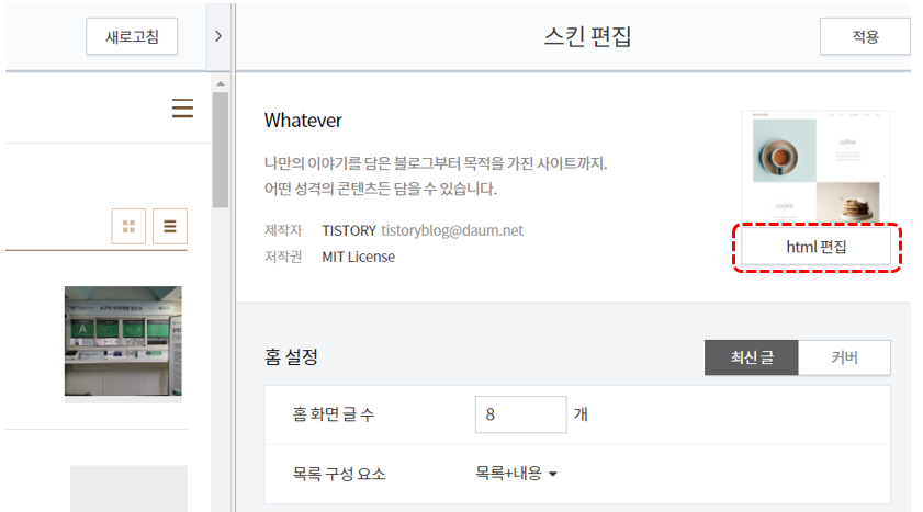 오른쪽에 열리는 html 편집창에서 <head>와 </head> 사이에 스크립트를 넣어 줍니다. html을 잘 모르시는 분은 타 코드에 영향을 주지 않도록 주의하시구요, 보이시는 것처럼 <meta> 아래에 바로 넣어 주시면 됩니다 그리고는 적용을 눌러 주세요