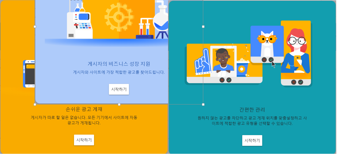 구글 애드센스를 이용하면 좋은점에 대해 팝업 광고?가 나옵니다. 한번 읽어보구요 시작하기를 눌러줍니다. 손쉬운 광고 게제, 게시자의 비즈니스 성장 지원, 간편한 관리. 실제 블로거의 입장에서 큰 장점들이 잘 정리되어 있습니다.