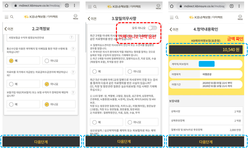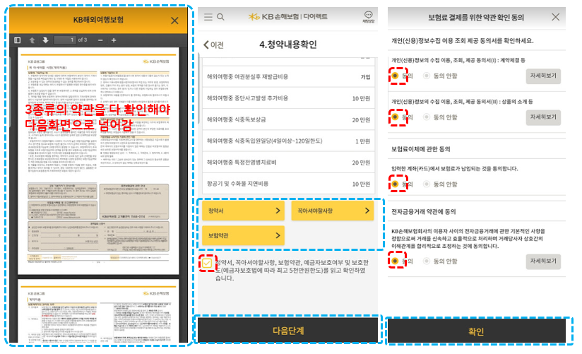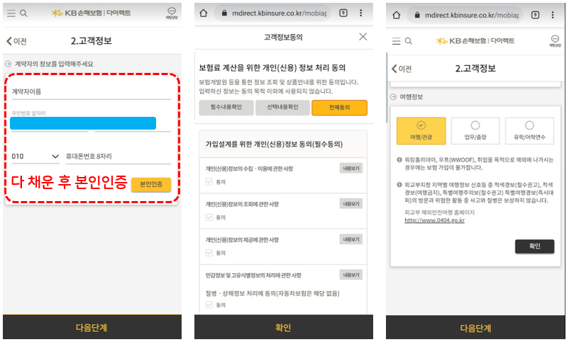 3종류의 약관을 다 봐야지 화면이 넘어 갑니다. 여기서 오류가 생기는 경우가 많은것 같아요, 여러번 시도하다가 안넘어 가면 새로고침 하거나 다른 보험사를 찾아 보는걸로~