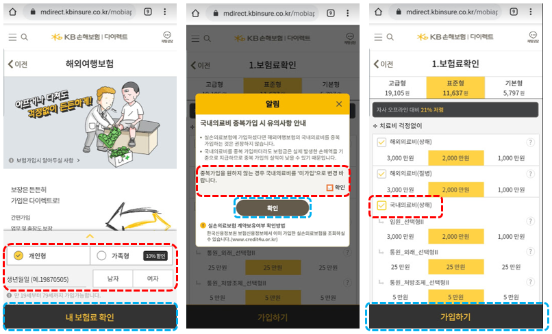 구글링을 통해 '해외 여행자 보험' 등을 검색하여 웹으로 접속 후 생년월일, 여행기간(시간포함)하여 보험료를 조회 합니다. 고급형, 표준형, 기본형을 살펴보고 가입하려는 형을 선택 합니다. 여기서 국내의료비 부분을 해제 또는 선택 합니다. 대부분 국내 실비보험을 많이들 들고 있음으로 중복 가입이 필요 없는 경우가 많습니다.