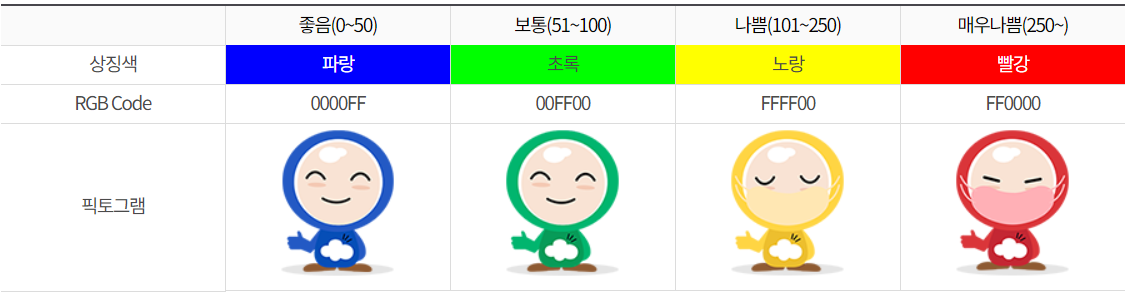 어떤가요? 평소에 뉴스등에서 많이 보던 숫자이요? 이 숫자가 250이상의 빨간색으로표시가 되어 있으면 일반인도 약한 영향이 유발될 수 있다고 하니 이 경우에는 항상 마스크를 꼭 챙겨야 겠습니다.