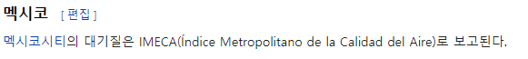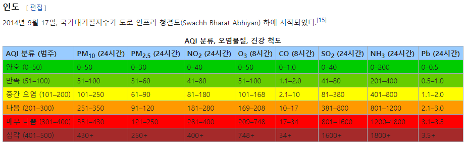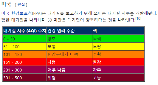 우리나라 환경청과 에어코리아를 살펴보면 나쁨 이상의 등급이 2개 물질 이상인 경우 가중치를 주어서 계산하고 있습니다. 통합대기 환경지수(CAI)는 우리나라에서 사용하는 지표 입니다. 공기 대기질을 측정함에 있어서 어떤 기준으로 측정 하느냐는매우 중요한데요, 각 국가별로 필요한 정보를 반영해야 하는 부분 때문에 공통의 수치를 사용하고 있지 않는 것으로 생각 됩니다.