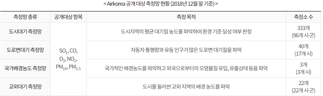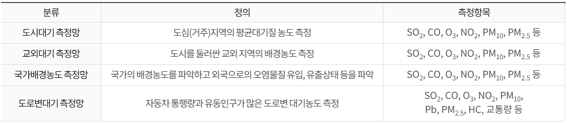 대기환경기준물질 6개 항목(아황산가스, 일산화탄소, 이산화질소, 미세먼지(PM10,PM2.5), 오존)을 측정 합니다. 그리고 이에 대한 오염도를 시계, 달력 등의 표현 방식과 접목하여 시간/일자/요일별로 제공합니다. 이를 기반으로 인체 영향과 체감오염도등을 감안하여 대기오염의 상황을 4개 등급(색상)으로 표현하여 제공하고 있습니다.