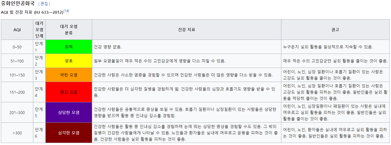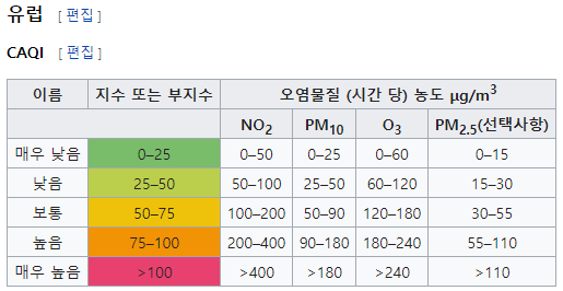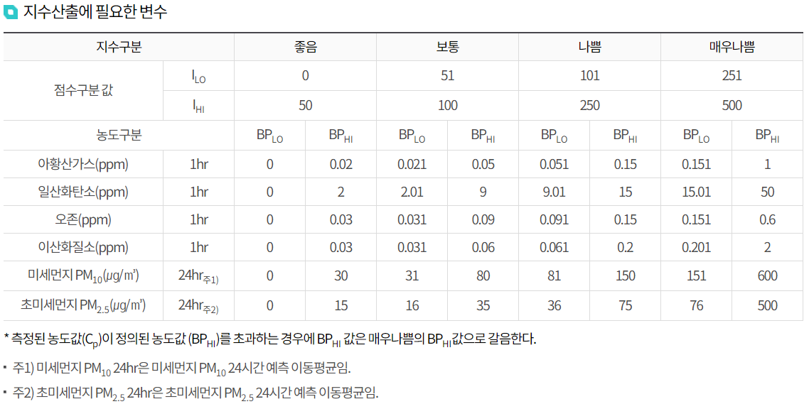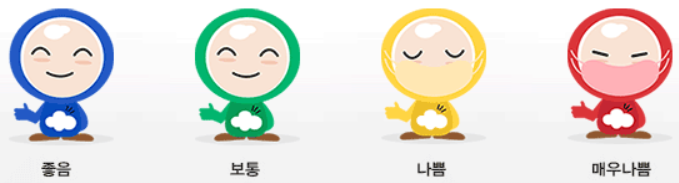 관련 내용도 홈페이지에 잘 나와 있는데요, 궁금해 하시는 분들을 위해 간단히 남겨 놓습니다. 통상 우리가 이야기 하는 미세먼지 농도를 측정하는 방법이며, 정확한 명칭은 통합대기환경지수(CAI) 입니다.