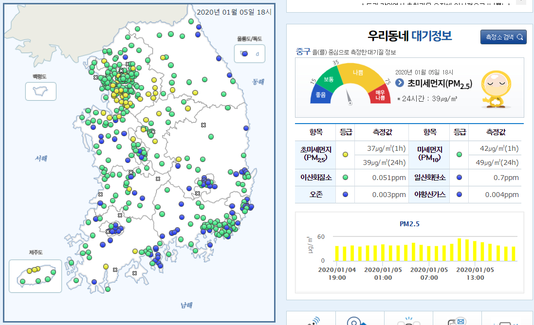 실제 미세먼지 농도는 카카오나 네이버를 통해 쉽게 확인할 수 있습니다. 또한 멀리 여행을 간다면 에어코리아 웹사이트에서 지도기반의 미세먼지 지도도 확인이 가능합니다.