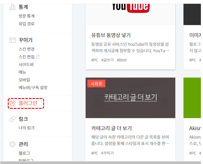 본인의 티스토리 블로그에 접속해서 관리자 메뉴에서 플러그인을 선택해 줍니다.