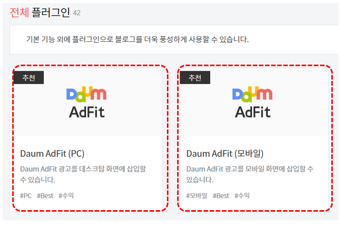 다음에서 가장 밀고있는 계속기업의 제1원천인지라, 맨 위에 두가지 종류의 AdFit을 보실 수 있습니다.