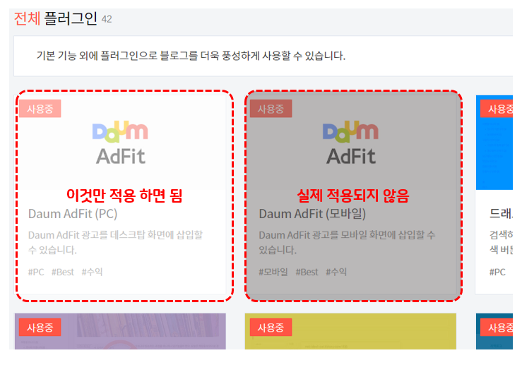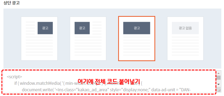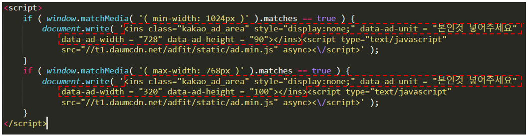 이렇게 변경한 스크립트를 플러그인 - 다음 애드핏(PC)에서 복사해 넣어 주시면 됩니다.