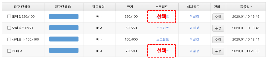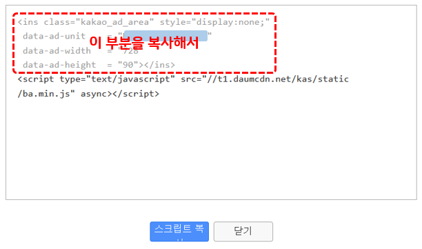 2. 카카오 애드핏 사이트에서 광고관리-광고단위-스크립트 에서 표시한 부분을 복사합니다.