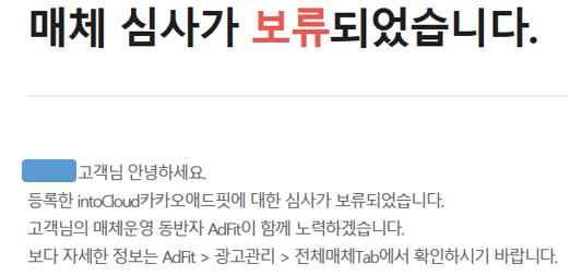 매체 심사가 보류 되었습니다, 들어가서 확인을 해 봐라는 내용 입니다.