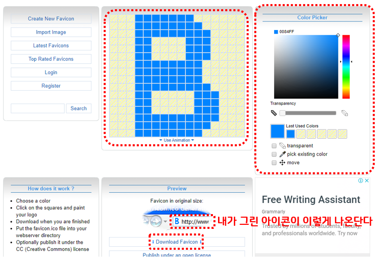 아래를 보면 내가 그린 파비콘이 어떻게 나오는지 확인이 가능하며, 마음에 들면 아래쪽에 다운로드를 선택해서 받아서 사용하시면 됩니다.