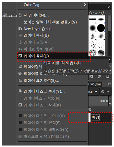 그리고 오른쪽 툴바에서 배경 - 오른쪽 마우스 클릭하여 레이어 삭제를 해 줍니다.