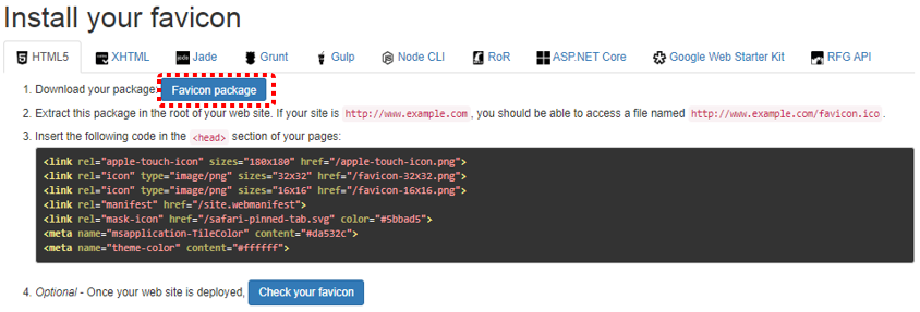 Favicon package를 눌러서 다양한 사이즈의 파비콘을 다운 받으면 완료!