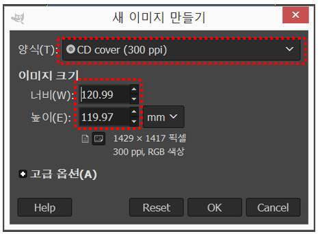 실행 시킨 후 새 이미지 만들기에서 양식을 CD cover로 선택하여 줍니다.