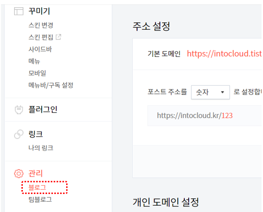 티스토리 블로그관리홈 - 관리 - 블로그 를 선택해 줍니다.