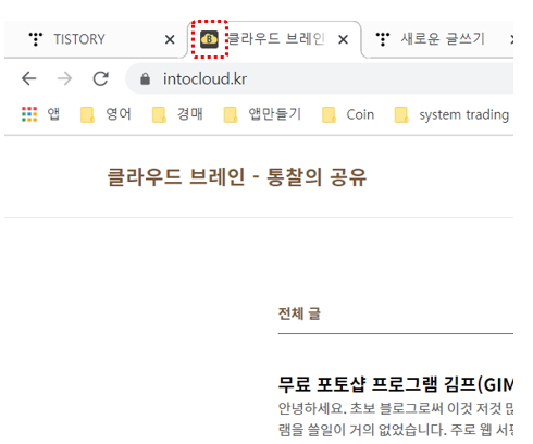 32 x 32 사이즈를 지원함으로 해상도가 높은 파비콘을 선택해 주고 저장하면 완료 입니다. 다시 자신의 블로그로 들어가서 확인해 보면 브라우저 상단에 파비콘이 변경되었음을 알 수 있습니다