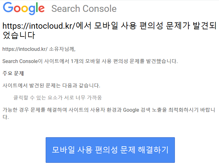 제게 온 메일은 '사이트 https://intocloud.kr/에서 새로운 모바일 사용 편의성 문제가 발견됨 이라는 제목 입니다.