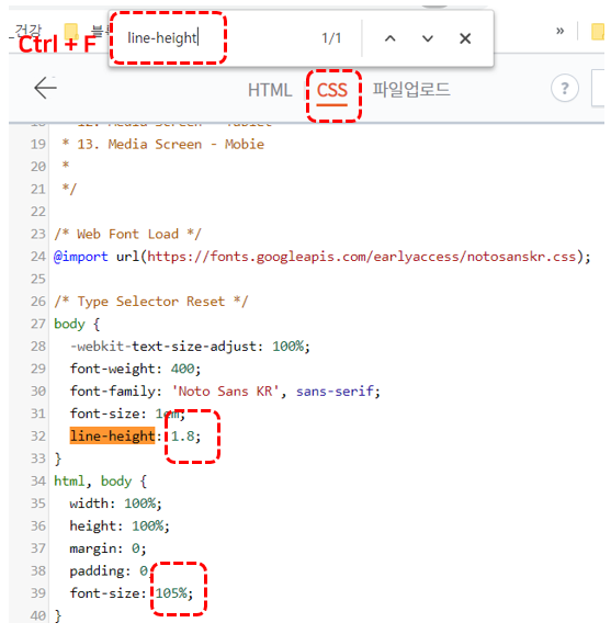 Ctrl + F로 line-height를 찾아 줍니다. 이것은 줄간격을 조절하는 건데요, 제 반응형 블로그에는 1.25로 되어 있었습니다. 조금씩 늘려 보니 1.8 정도는 되야 쓸만할것 같아서 1.8로 수정 하였습니다.