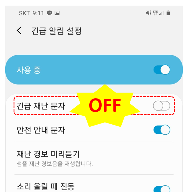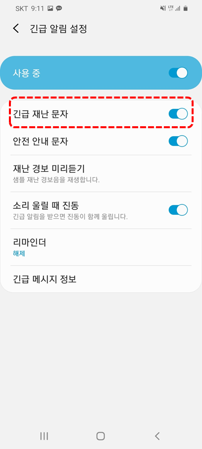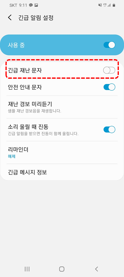 사용중 긴급재난문자를 꺼 주면