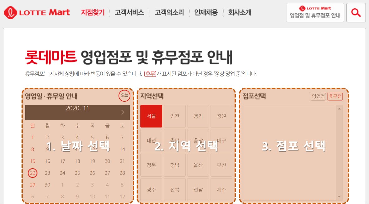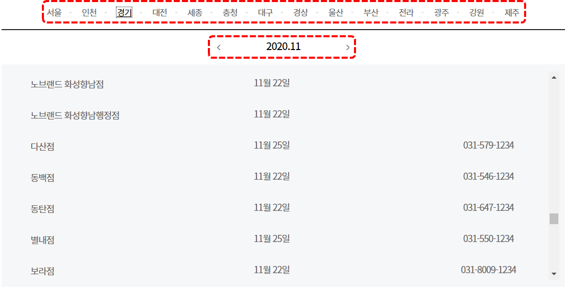 이마트 계열의 지역명과 검색하고자 하는 달을 선택하면 해당하는 점포의 그달의 휴무일을 바로 알 수 있지요.