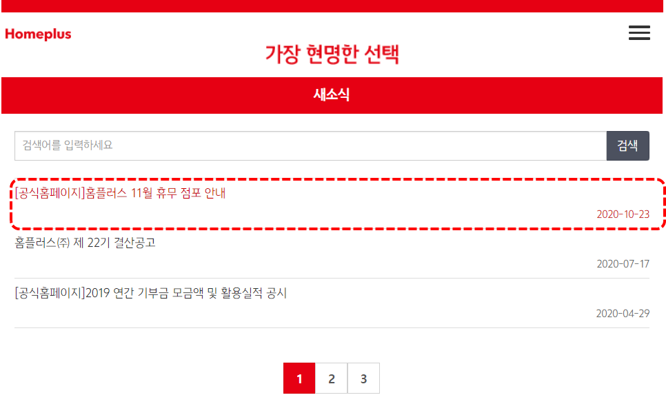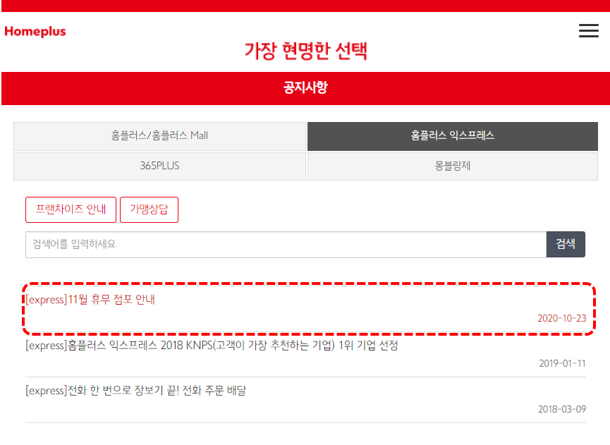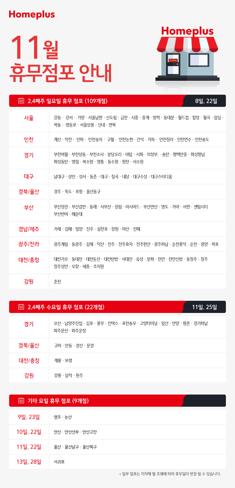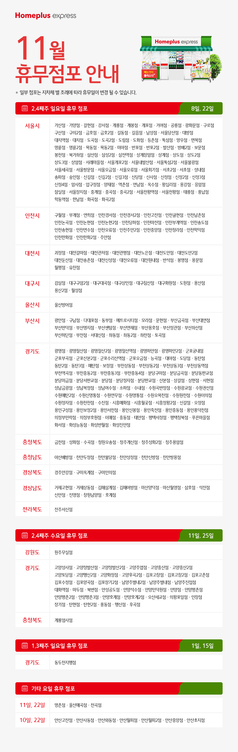 홈플러스는 매월 페이지 공지를 확인해서 홈플러스 휴무점을 확인 해야 합니다. 홈플러스와 홈플러스 익스프레스의 휴무일에 대해서 매달 홈페이지에 공지를 하고 있습니다.