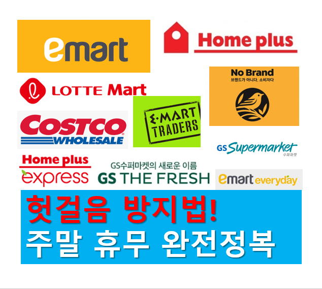 한국의 대형마트는 여러가지 법적인 이유로 일요일은 의무적으로 휴무가 적용됩니다. 주말휴무가 해당되는 대형마트는 이마트, 롯데마트, 홈플러스 뿐만이 아니라 코스트코, 이마트 트레이더스, 노브랜드, 홈플러스 익스프레스, GS수퍼마켓 까지 모두 포함됩니다.