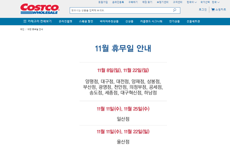 코스트코는 전국의 점포숫자가 많지 않습니다. 코스트코 홈페이지의 휴무일 안내 페이지에서 간단하게 확인이 가능해요.