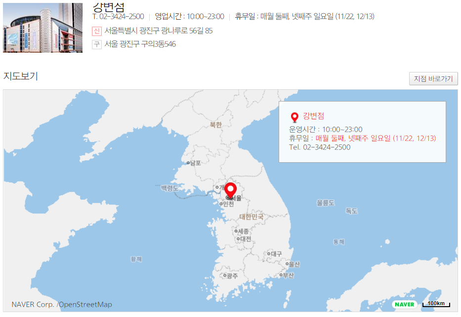 롯데마트의 경우 해당 점포를 선택하면 자신이 찾는 점포가 맞는지 지도상에서 확인이 가능해요. 롯데마트의 지역마다 다른 휴무일이 시행되고 있으니 찾고자 하는 위치가 맞는지 잘 확인해 보고 방문합시다.