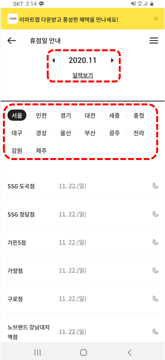 모바일 : 이마트, 노브랜드, 이마트트레이더스 우리동네 휴무일 확인가기