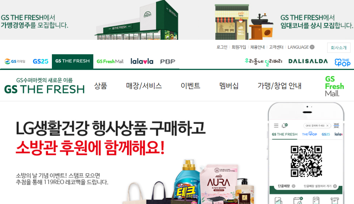 GS수퍼마켓도 일요일에 장을 보기 위해서는 사전에 휴무일을 꼭 확인해야 합니다. 홈페이지에 GS수퍼마켓 휴무일 확인을 위해 홈페이지에 접속하면 아래와 같이 나옵니다. GS수퍼마켓은 최근 GS THE FRESH로 재 브랜딩을 했습니다.