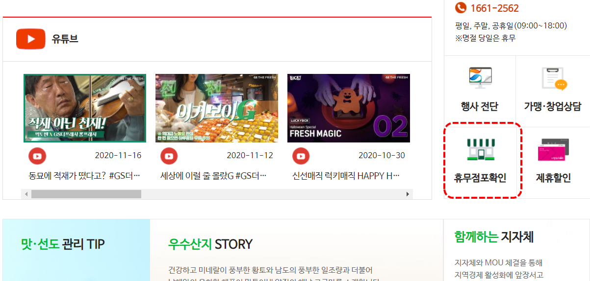 GS THE FRESH (GS수퍼마켓) 홈페이지 아래쪽으로 스크롤을 하면 오른쪽에 휴무점포 확인 메뉴가 있습니다.