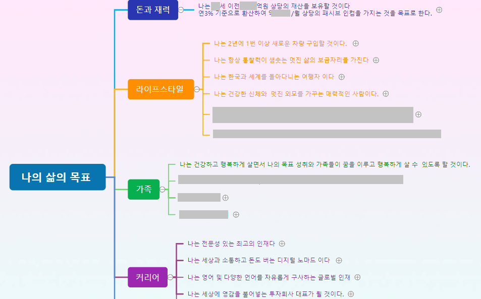 큰 그림에서 재력, 라이프스타일, 가족, 커리어 의 네 가지 관점에서 이루고자 하는 목표를 세우고, 구체화를 하였습니다. 처음 큰 그림에서 목표를 세우고, 세부적인 부분을 적어 나갔구요. 몇 번을 읽어 보면서 수정을 하였습니다.