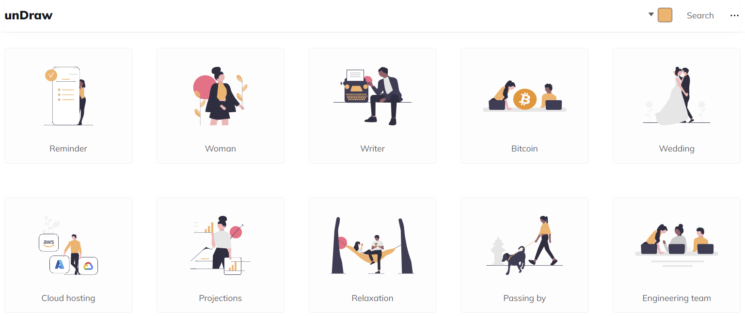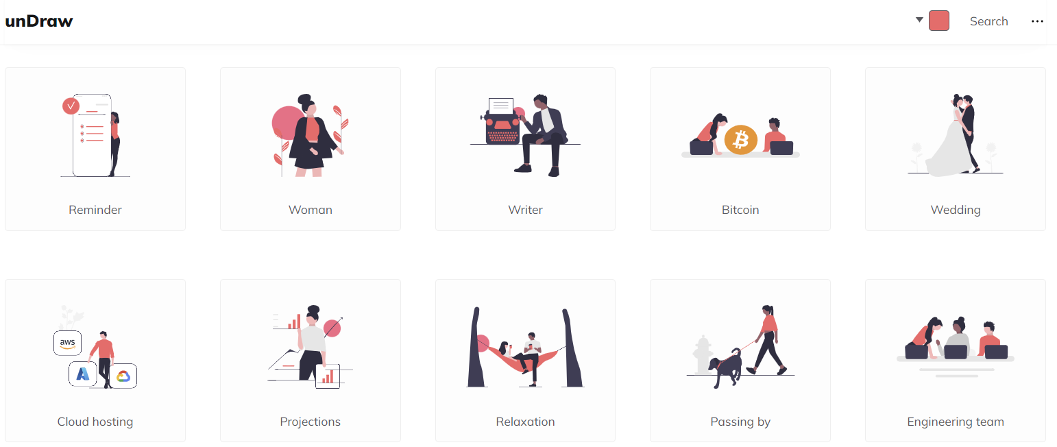 언드로우(unDraw)에서 다운로드 해서 사용 가능한 무료 일러스트는 위의 두 그림과 같이 자신이 원하는 색상을 제공되는 일러스트에 미리 적용하여 다운로드 받을 수 있는 장점이 있습니다.