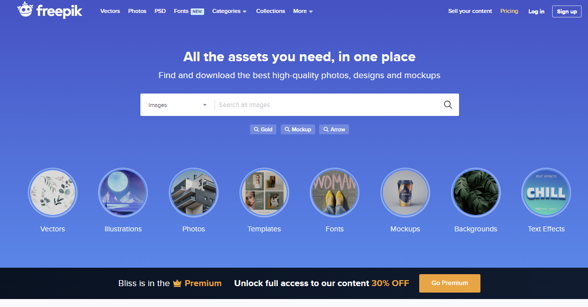 벡터 일러스트 뿐만 아니라, 사진, PSD, 폰트 등의 다양한 리소스가 있습니다. 다양한 종류의 리소스를 제공하는데 비해서 카테고리 정리가 잘 되어 있습니다. ppt, 기획서 등 의 다양한 종류의 작업을 할때 활용하기 좋습니다.