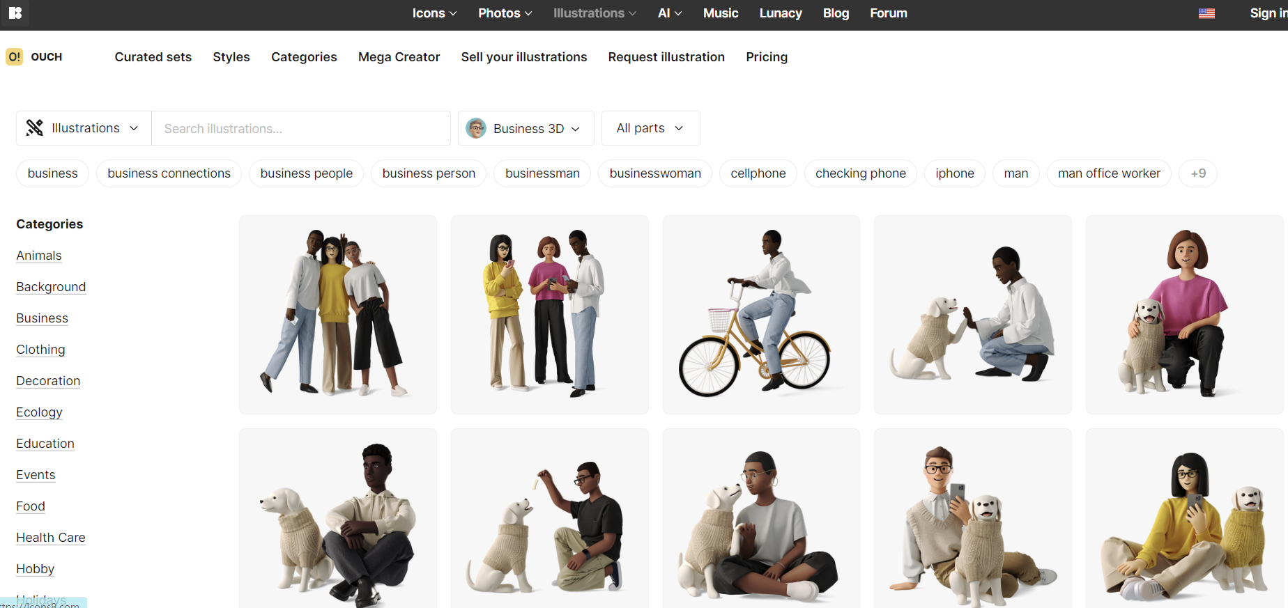 카테고리별로 유사한 느낌의 일러스트 들이 잘 정리되어 있습니다. 특히나 다양한 3D 일러스트가 있어서 유니크한 자료를 만들때 느낌있게 사용이 가능합니다.